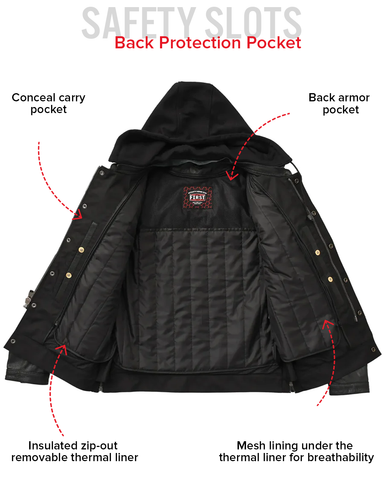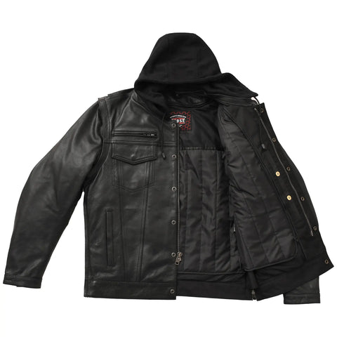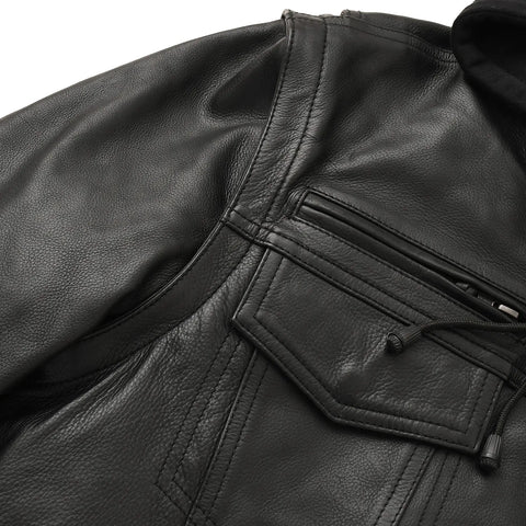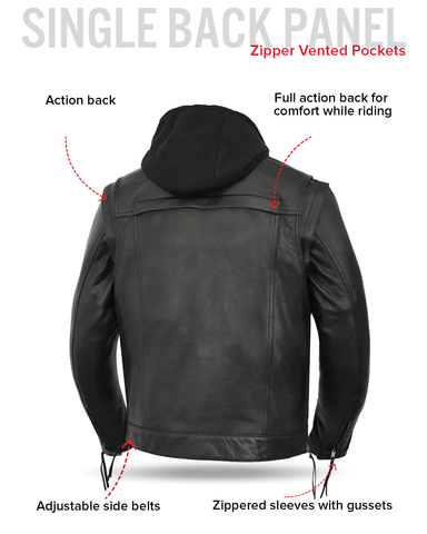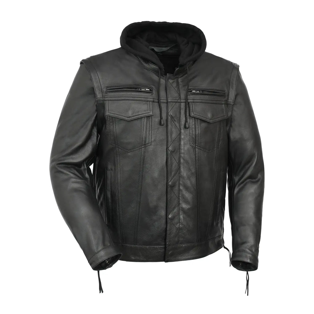 Nightstrike is a stealth-ready motorcycle jacket built for riders who want maximum function with a clean, tactical look. Crafted from premium cowhide and designed with a modern club-style chest layout, this jacket includes a removable zip-out hood, full-sleeve thermal liner, and plenty of vents and pockets to keep you comfortable during long rides. It also includes conceal carry pockets and armor pockets for CE rated armor, making it ideal for everyday riding.