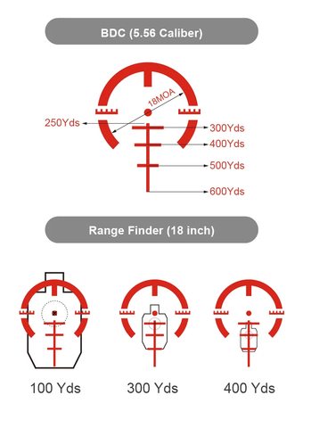 Illuminated BDC Reticle: This horseshoe BDC reticle features a 1 MOA dot surrounded by a 18-19 MOA  circle. Choose from 11 brightness settings to gain a decisive edge with fast target acquisition in everything from pitch-black interiors to blinding midday sun. The bullet drop holdovers are based on the 5.56 caliber at 250yds to 600yds.