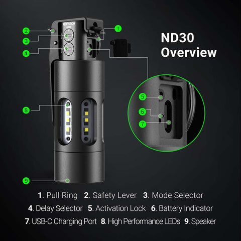 Time Delay and Pulse Settings: The ND30B gives you the ability to tailor your response to the environment, the threat, and your escape plan with time delay and pulse settings: .5 second delay for immediate, point-blank threats, 1s delay for room-entry or corner-clearing situations, 1.5s delay for mid-distance throws, or 3s delay for strategic activation and distraction. You can also choose between individual pulses or a continuous 12s siren.