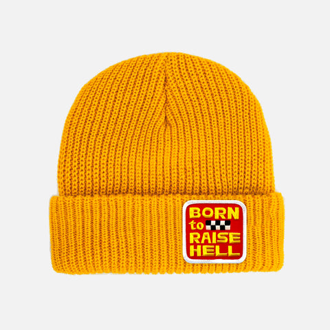 This here Beanie delivers 10 Tons of manhood directly to your big fat melon! This epic Born To Raise Hell Beanie is part of our new Classic Race Collection. This mean toasty machine features a big burly vintage Born To Raise Hell patch sewn on the cuff. This Beanie is as old school as it gets!