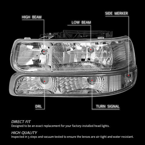 - This item includes: 1 pair of headlights / 1 pair of bumper lights (lower bumper light fits OE grill)