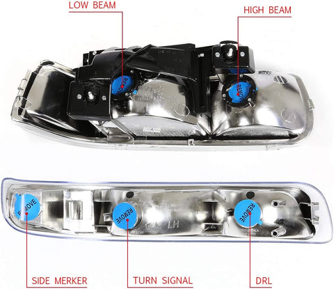 - This item includes: 1 pair of headlights / 1 pair of bumper lights (lower bumper light fits OE grill)