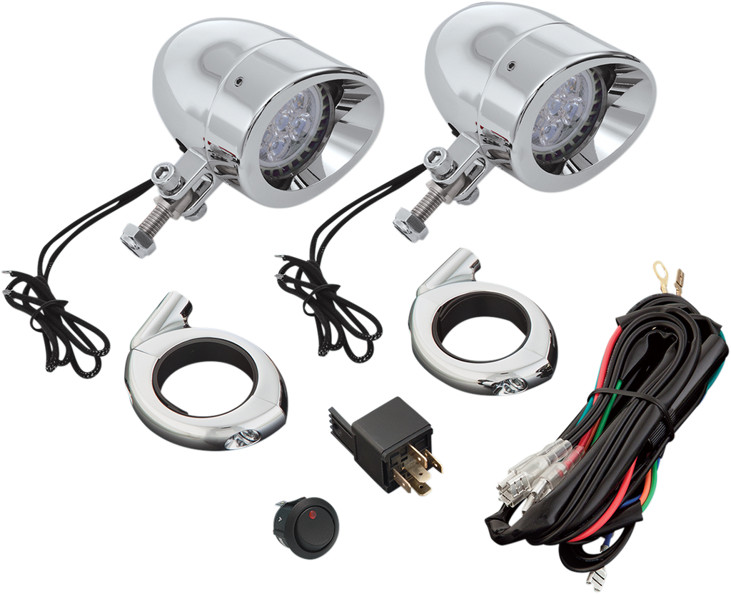 • The die-cast clamps fit cruisers with 38mm to 41mm forks and come with a wire harness, relay and switch