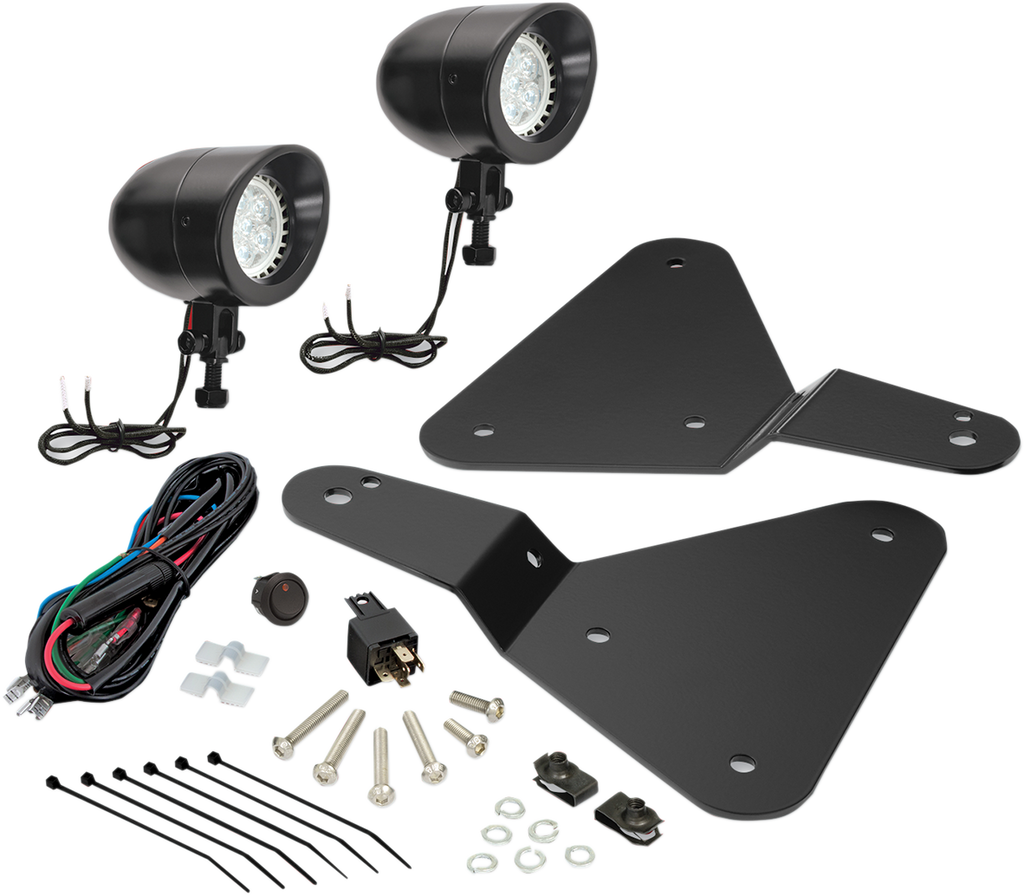 - A pair of black satin brackets easily secures to the lower fairing into existing mounting holes, giving these auxiliary lights a floating effect