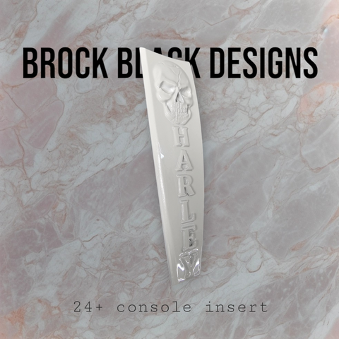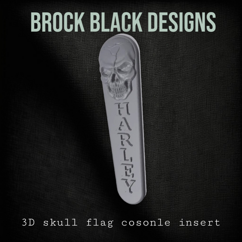 Custom built Harley console insert with 3D skull flag theme. Can do any design, color combination or style of bike. These are individually built and designed for the customer. These take about 3 weeks to build. We will verify information after the order is placed. Contact us if you have any questions or special requests. Measures 2 1/4 top, 1 29/64 bottom and 8 11/32 length. Does not fit some 21+ touring models consoles.