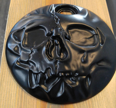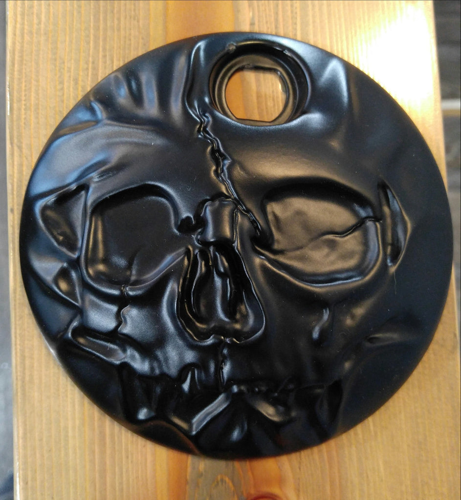 • Custom designed 3D stretching skull through a Harley-Davidson fuel door. Comes in powder coat flat or gloss