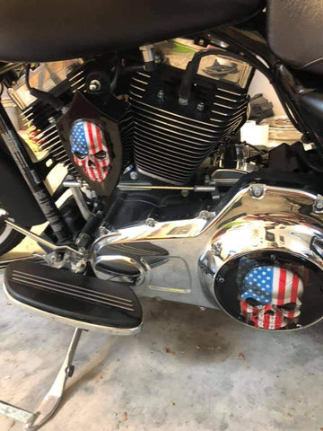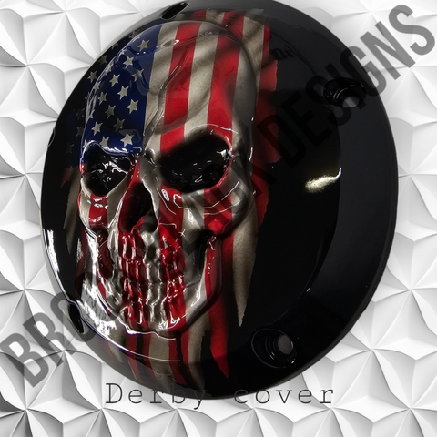 Custom built 3D skull with full color American flag draped over it on Harley-Davidson derby cover. Can do any design, color combination or style of bike. These are individually built and designed for the customer. These take about 3 weeks to build. We will verify information after the order is placed. Contact us if you have any questions or special requests.