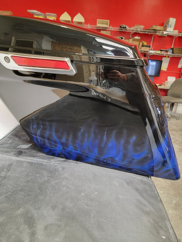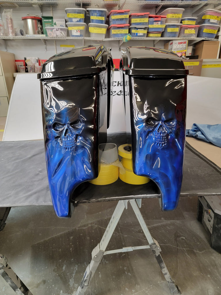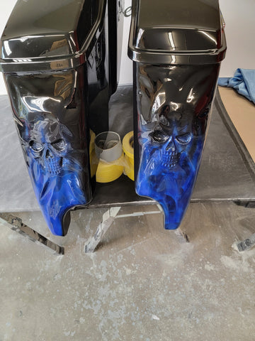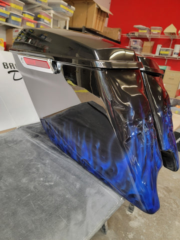 Custom Built 3D skulls stretching through rear bag systems with flames. Can do any style, design or theme. These are individually built and designed for the customer. These take 3 to 4 weeks to build. We will verify the order and any changes upon order received. These are just the bags and lids. No bracket systems, but can get them for an additional cost.