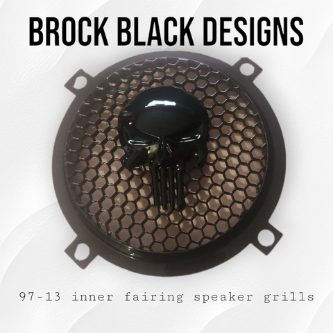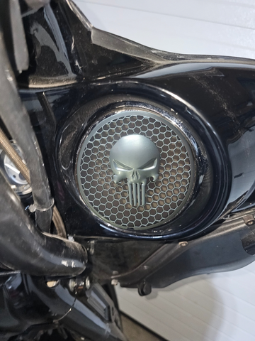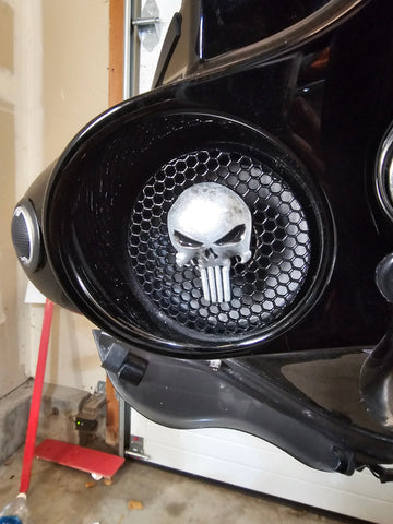 We can do webbed or solid Punisher skull. To order the correct size grills, its the size of the hole in the fairing for years 97 to 2023. These are designed for stage 3 speakers. If your grill requires additional depth, please provide measurements or specify the added depth required for accommodating your aftermarket speaker. Put in notes any specifications such as colors, year and models of bike. We verify every order.