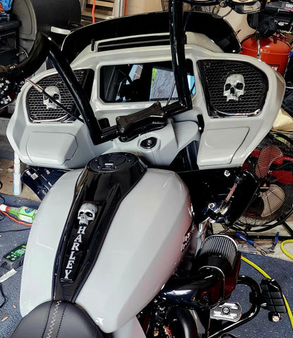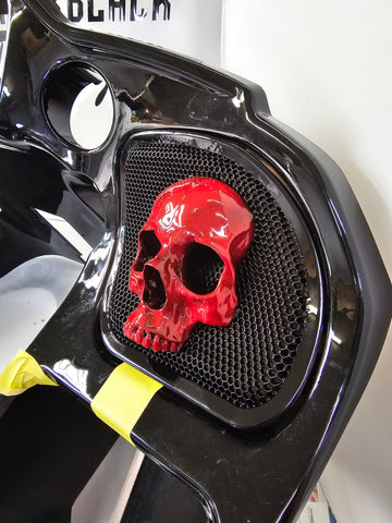 introducing our revolutionary 3D speaker covers that seamlessly accommodate speakers of all sizes. Each cover is meticulously crafted to order, tailored exclusively for you, with a production timeline of approximately three weeks. Personalize your experience with a spectrum of color combinations, and we cater to any bike's year or make. Order verification ensures precision before production.
