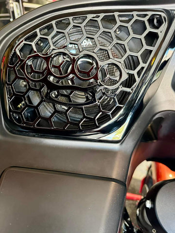 Introducing our revolutionary 3D speaker covers that seamlessly accommodate speakers of all sizes. Each cover is meticulously crafted to order, tailored exclusively for you, with a production timeline of approximately three weeks. Personalize your experience with a spectrum of color combinations, and we cater to any bike's year or make. Order verification ensures precision before production.