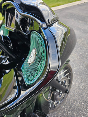 Introducing our revolutionary 3D speaker covers that seamlessly accommodate speakers of all sizes. Each cover is meticulously crafted to order, tailored exclusively for you, with a production timeline of approximately three weeks. Personalize your experience with a spectrum of color combinations, and we cater to any bike's year or make. Order verification ensures precision before production.