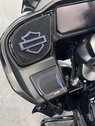 Introducing our revolutionary 3D speaker covers that seamlessly accommodate speakers of all sizes. Each cover is meticulously crafted to order, tailored exclusively for you, with a production timeline of approximately three weeks. Personalize your experience with a spectrum of color combinations, and we cater to any bike's year or make. Order verification ensures precision before production.