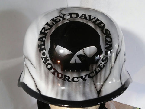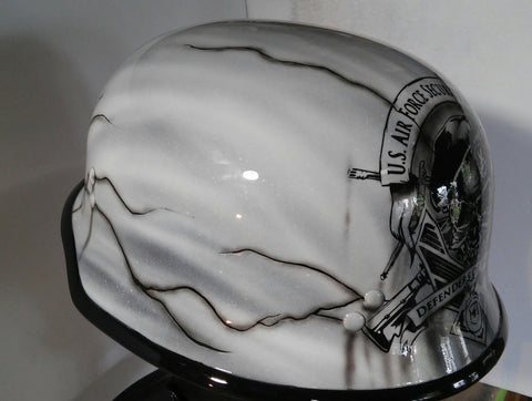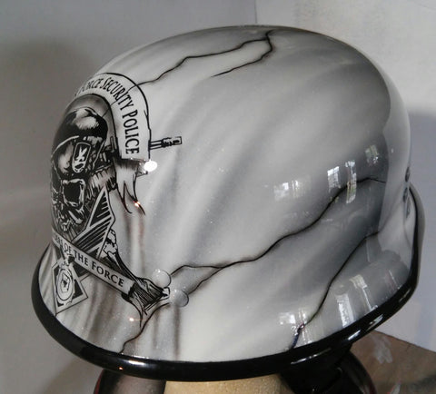 9mm DOT German helmet with Willie G symbol on front and Air Force Police Logo on back on white granite Can make any size and style of helmet. These are hand carved and airbrushed for an unique look. These are individually built and designed for the customer. These take about 3 weeks to build. We will verify information after the order is placed.